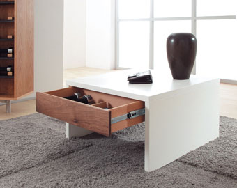 Der Corpus aus edlen Massivhölzern oder farbig lackiertem MDF, die beiden Schübe sind wahlweise im gleichen Farbton oder als Gegenakzent andersfarbig.