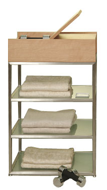 Die Regal-Einteilung: 3 Glasböden und 1 Container mit Klappen inkl. Hantelbänkchen.